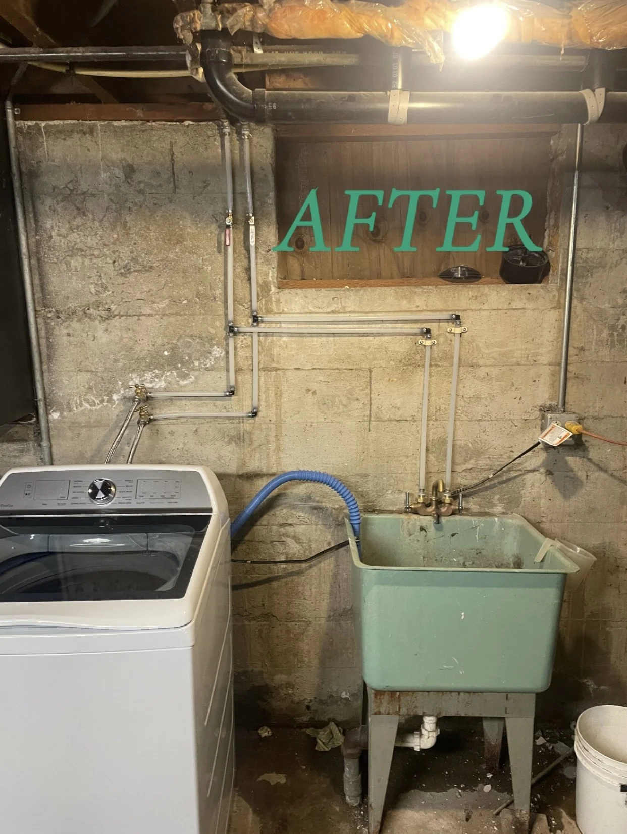 A laundry room with a washing machine on the left, a green utility sink on the right, and exposed pipes on the wall. The word 'AFTER' is written in green text across the upper part of the image.